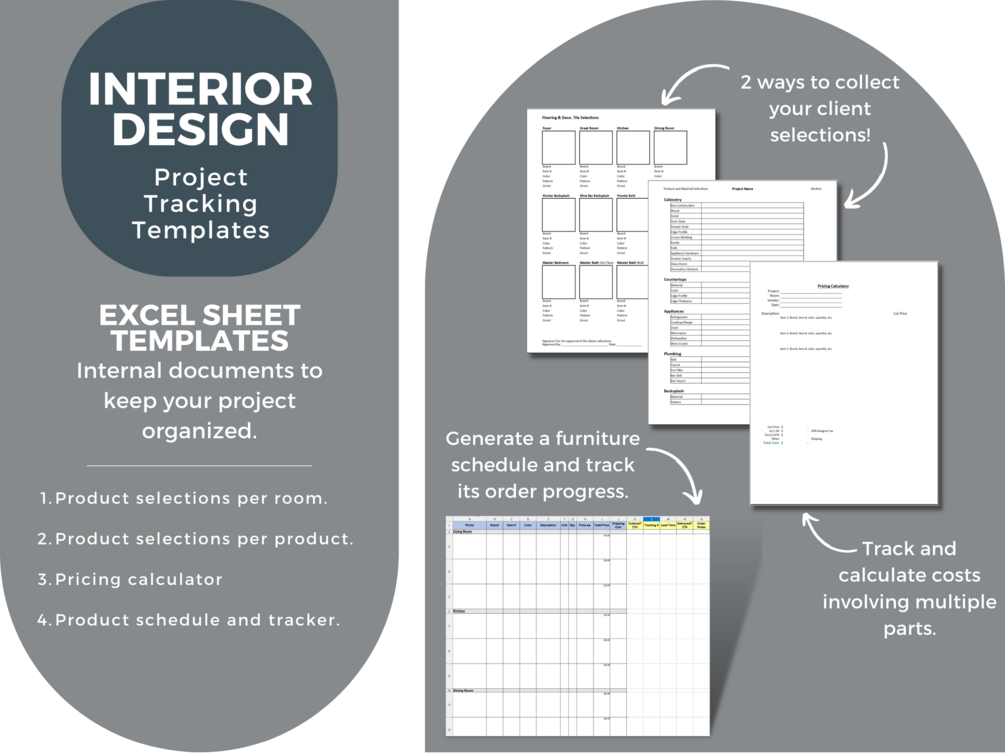 These interior design project planner templates will help you track the many moving parts of a design project process. They can also be used for client sign-offs to verify and track your interior design project selections. Keep everyone on the same page!